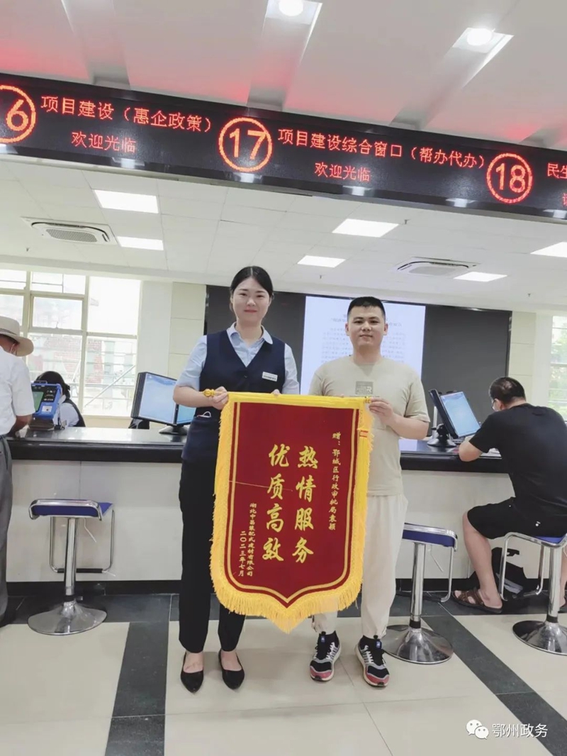 “热情服务,优质高效”7月20日,湖北中昌装配式建材有限公司代表人何先生喜笑颜开地来到鄂城区政务服务中心,为中心项目建设综合窗口送来了一面锦旗,对窗口的工作人员袁颖高效率工作和热情服务表示感谢。