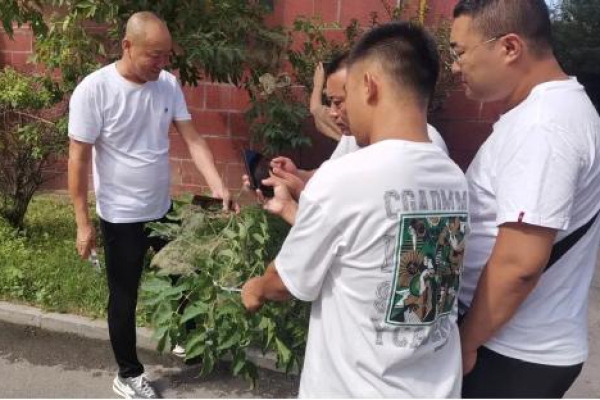 8月14日上午,福民街道桥西社区繁改网格党群服务站深入福兴家园小区解决虫害问题,深入推进我为群众办实事走深走实。桥西社区接到居民反映,在福兴家园小区发现美国白蛾,接到消息后街道领导、社区工作人员以及物业人员第一时间到达现场查看情况,立刻联系林业局相关人员现场查看,研究解决方案,经过多番沟通,最后将存在虫患枝叶剪下进行踩踏杀虫,同时对虫害进行消杀。