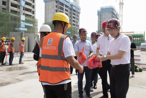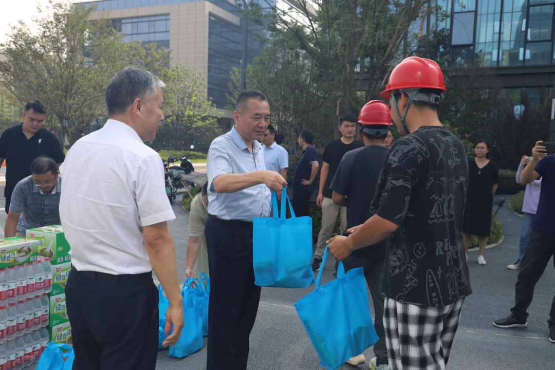 8月11日上午,集团公司总法律顾问胡声涛一行赴G60松江?中安科创园南区项目现场开展“送清凉”慰问活动。工地上,胡声涛看望慰问炎炎烈日下仍然奋战在建设一线的工作人员,向工人代表发放清凉解暑慰问品,叮嘱大家合理安排作息时间,注意防暑降温、保重身体。