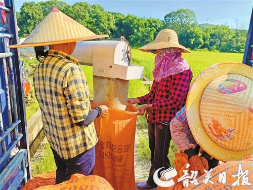日前,笔者在新韶镇陈江村看到,乡道两旁的稻田一望无际,田野里沉甸甸的稻穗在阳光的照射下显得格外耀眼。工人顶着烈日驾驶收割机在田地间来回穿梭,一行行稻谷卷入齿轮,收割、脱粒、装车转运,金黄的稻谷随着收割机的管道倾泻而下,农户在田埂上忙着装袋、打包……