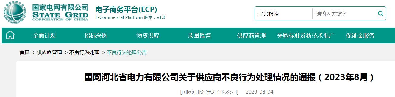 【电缆网讯】近日,国家电网电子商务平台发布《国网河北省电力有限公司关于供应商不良行为处理情况的通报(2023年8月)》。