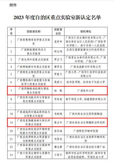 近日,自治区科技厅公布了2023年度自治区重点实验室新认定名单,我校申报的“广西药物精准检测与筛选重点实验室”和“广西结直肠癌基础与转化研究重点实验室”位列其中,至此,我校已获批14个自治区重点实验室。