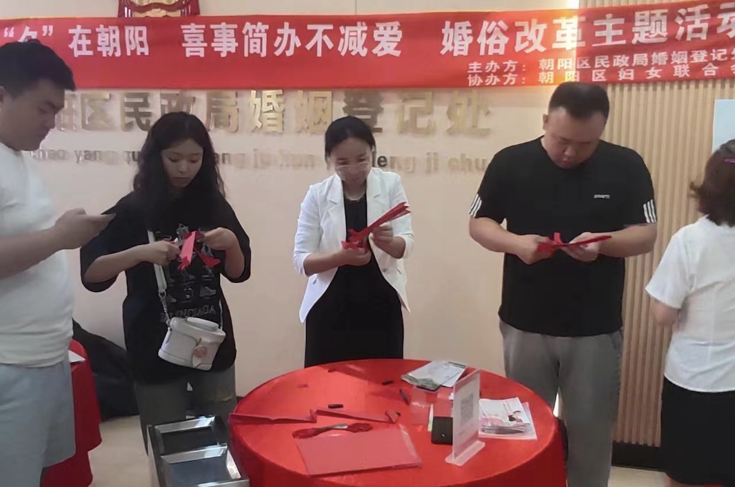 8月22日,七夕,很多年轻人选择在当天喜结良缘。为推动移风易俗,弘扬时代新风,树立婚姻嫁娶新理念,区民政局婚姻登记处联合区妇联开展“不‘七’而遇 满心欢‘夕’在朝阳 喜事简办不减爱”婚俗改革主题活动。