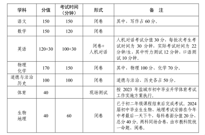 2023届初三学生生物、地理测试已于2022年初二年级课程结束后完成,因故未能参加的学生须于今年报名参加补测。体育考试按《2023年盐城市初中毕业升学体育考试工作实施方案》(另行公布)执行。