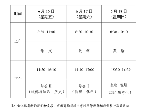 答:今年中考语文、数学、英语、物理、化学、道德与法治、历史科目的考试安排在6月16日—18日进行,具体日程如下。