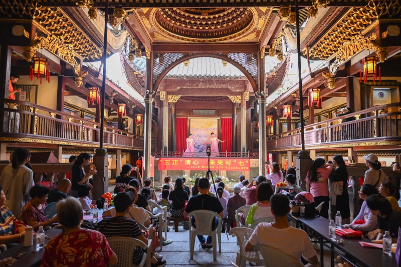 为学习党的二十大精神,进一步培育和树立社会主义核心价值观,传承中华民族优秀传统文化,引导广大市民树立优良家风、推动家庭和睦、邻里互助的良好风气,开展好“存正心、守正道、养正气”新风正气福建“名片”践行活动,2023年8月21日上午,“‘三正’清心 未来可‘七’”2023年“我们的节日·七夕节”台江区主场义洲专场暨“节日感党恩 共话新时代”主题活动在第一批“三正”新风正气福建“名片”宣传教育示范点——古田会馆举办。