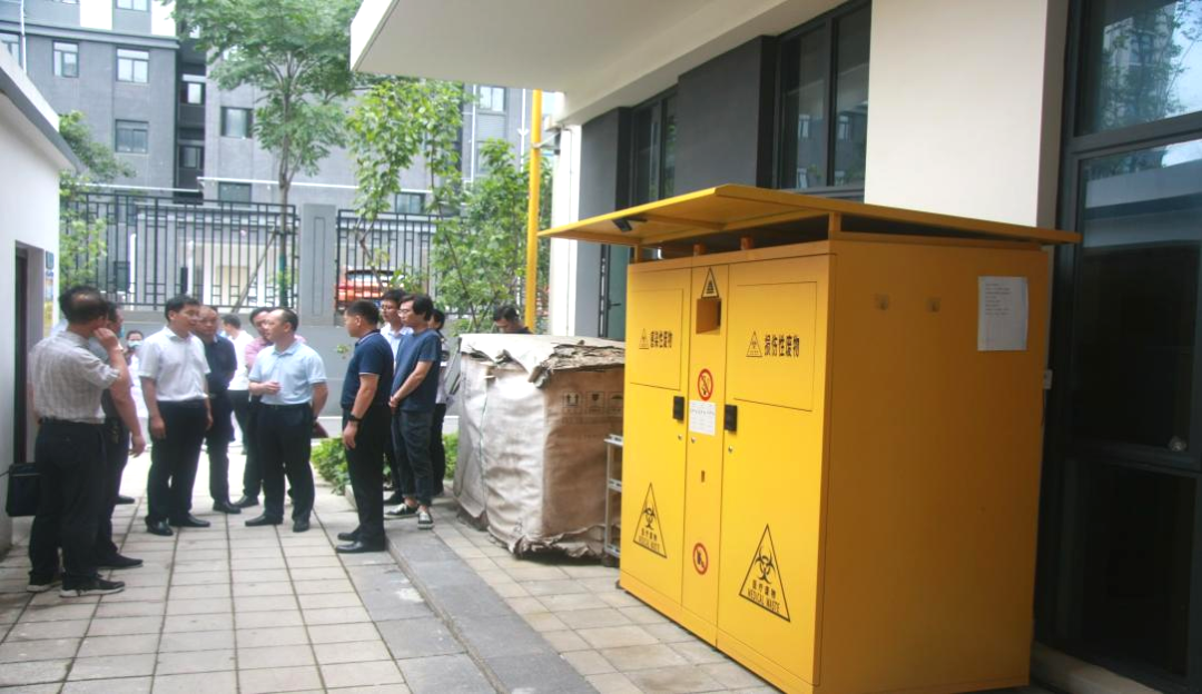 在九峰社区卫生服务中心,调研组听取小型医疗机构医疗废物智能化集中收集暂存情况介绍,现场观看了医疗废物智能化收集演示。