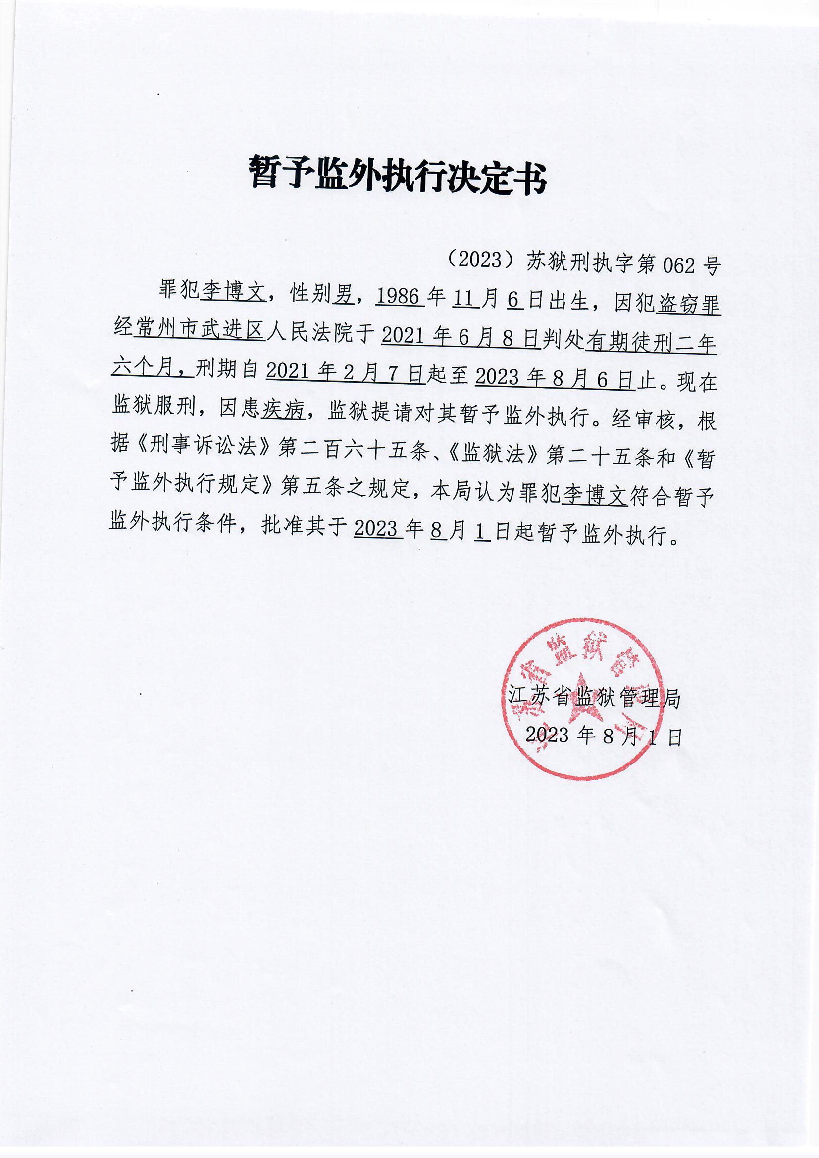 暂予监外执行决定书(2023)苏狱刑执字第062号