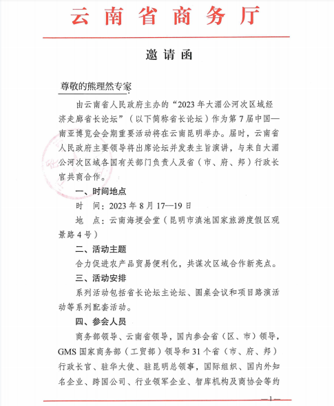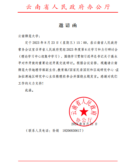 近日,我校地理学部副主任熊理然教授受邀参加了云南高水平对外开放系列高层会议,分别是8月17日在昆明召开的“2023年大湄公河次区域经济走廊省长论坛圆桌会议”,8月23日由省政府党组书记、省长王予波主持召开的省政府党组理论学习中心组学习和力行研讨会。在省政府党组书记、省长王予波主持召开的省政府党组理论学习中心组学习和力行研讨会上,熊理然教授以《经济全球化新叙事与云南发展的新机遇》为主题进行了交流汇报,部分省领导及参会同志与熊理然教授进行了互动交流。