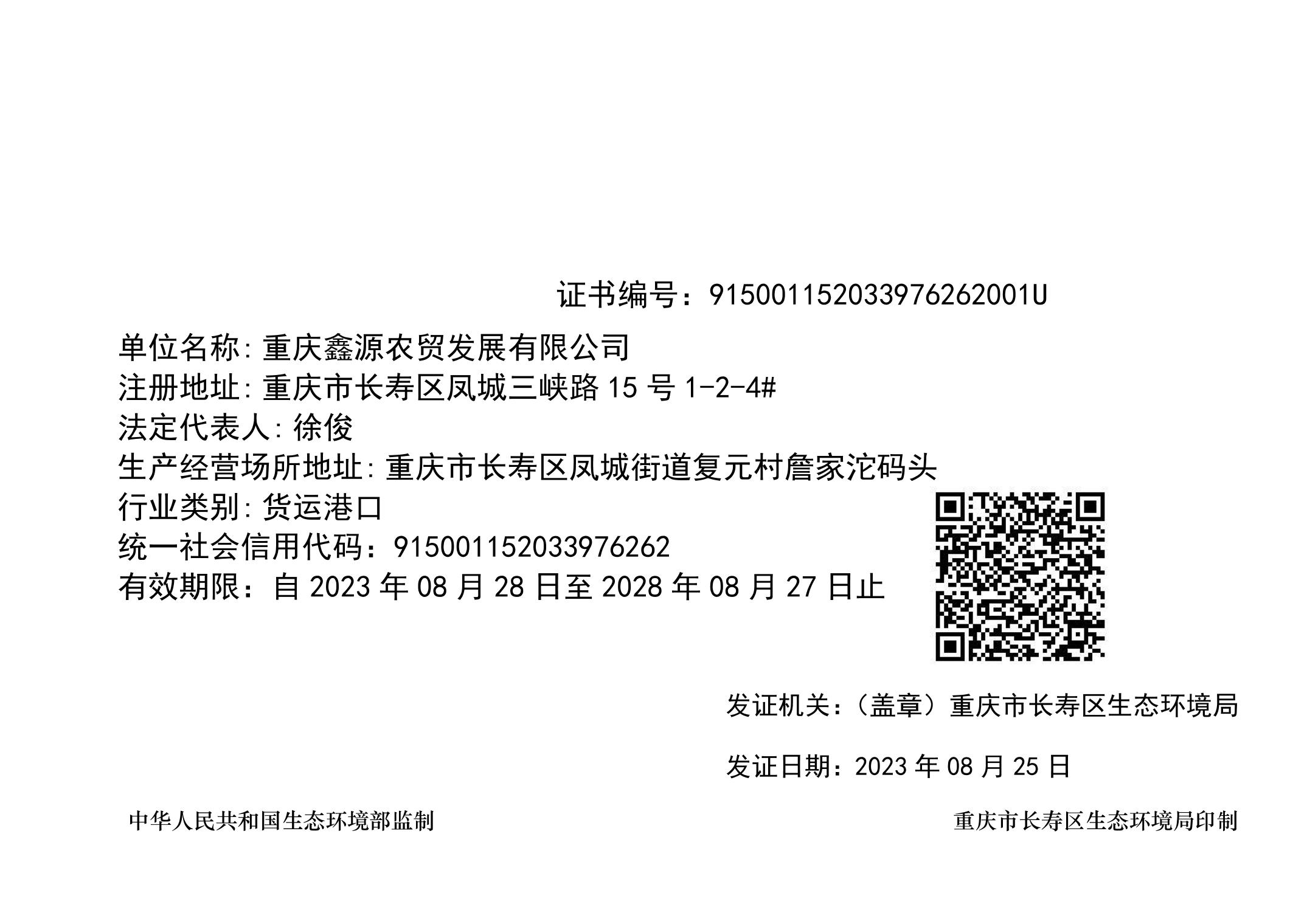重庆鑫源农贸发展有限公司排污许可证