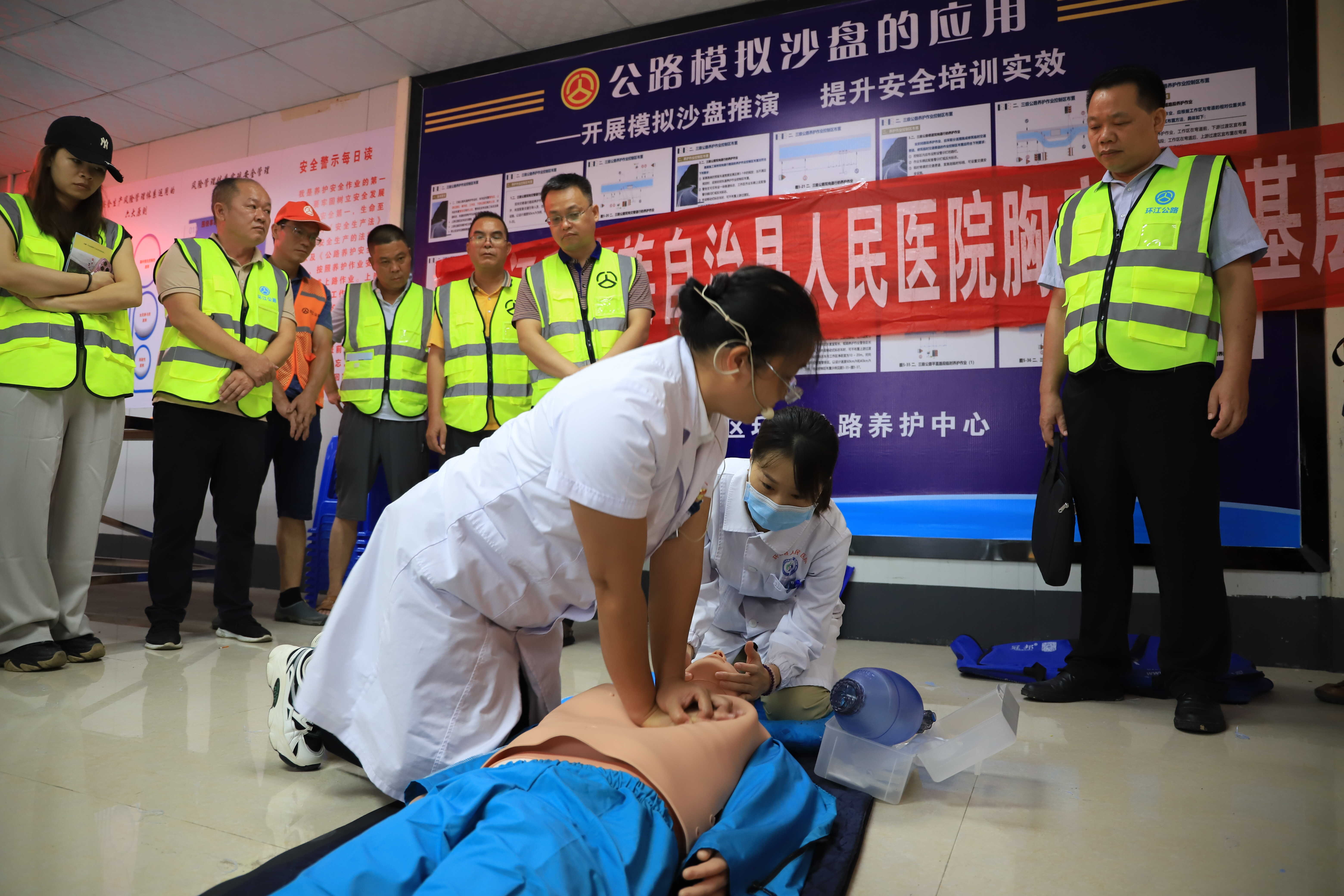 活动中,养护专业工程师向干部职工讲解二级、三级、四级公路以及桥涵养护作业控制区布置、安全设施布设和安全作业管理等方面的知识。来自环江毛南族自治县人民医院的3名专业医师通过案例分析、模拟演练等形式,讲解发生安全事故时如何迅速判断、准确报警、合理救援,并现场示范操作心肺复苏术,提升干部职工的自救互救能力。