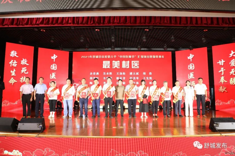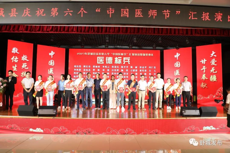 8月18日下午,我县在舒城县人民医院举办2023年庆祝第六个“中国医师节”汇报演出暨颁奖典礼。县委常委、宣传部长、统战部长倪敬云,县人大常委会副主任陶才,副县长汪健,县政协副主席朱传旭出席典礼。县卫健委,各乡镇、开发区、各卫生健康单位分管负责人,及100名受表彰的2023年度“舒城县医德标兵”、“舒城县最美村医”等参加典礼。