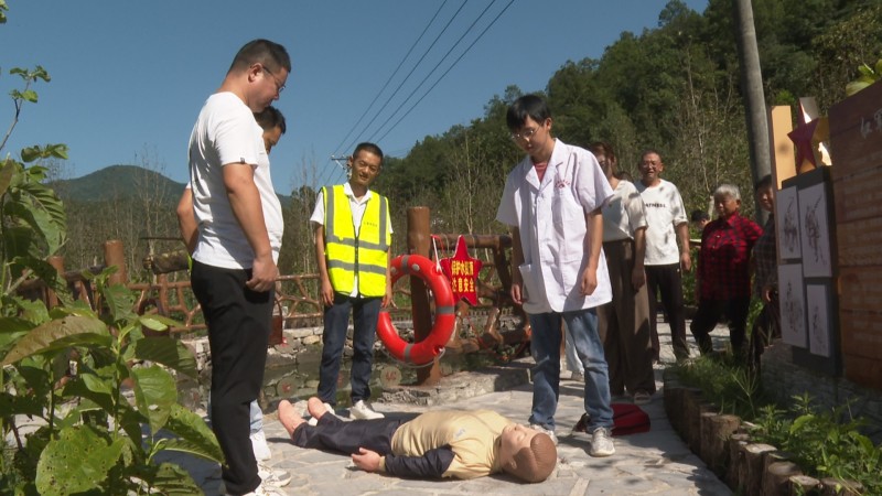 在演练主会场渔洋关镇王家坪村,“N员”李晶炼在红军井附近发现有人溺水后,迅速向村里报告。