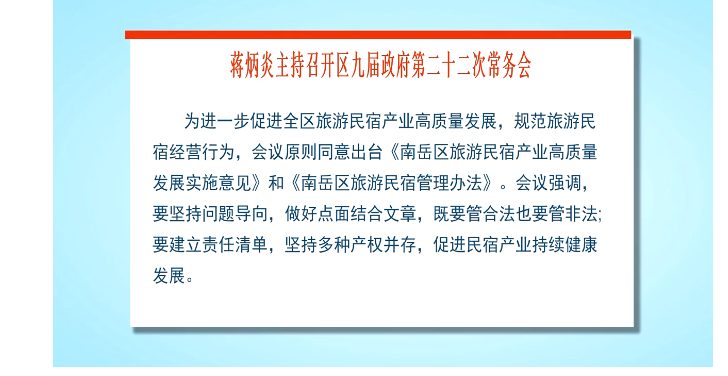 为进一步促进全区旅游民宿产业高质量发展,规范旅游民宿经营行为,会议原则同意出台《南岳区旅游民宿产业高质量发展实施意见》和《南岳区旅游民宿管理办法》。会议强调,要坚持问题导向,做好点面结合文章,既要管合法也要管非法;要建立责任清单,坚持多种产权并存,促进民宿产业持续健康发展。