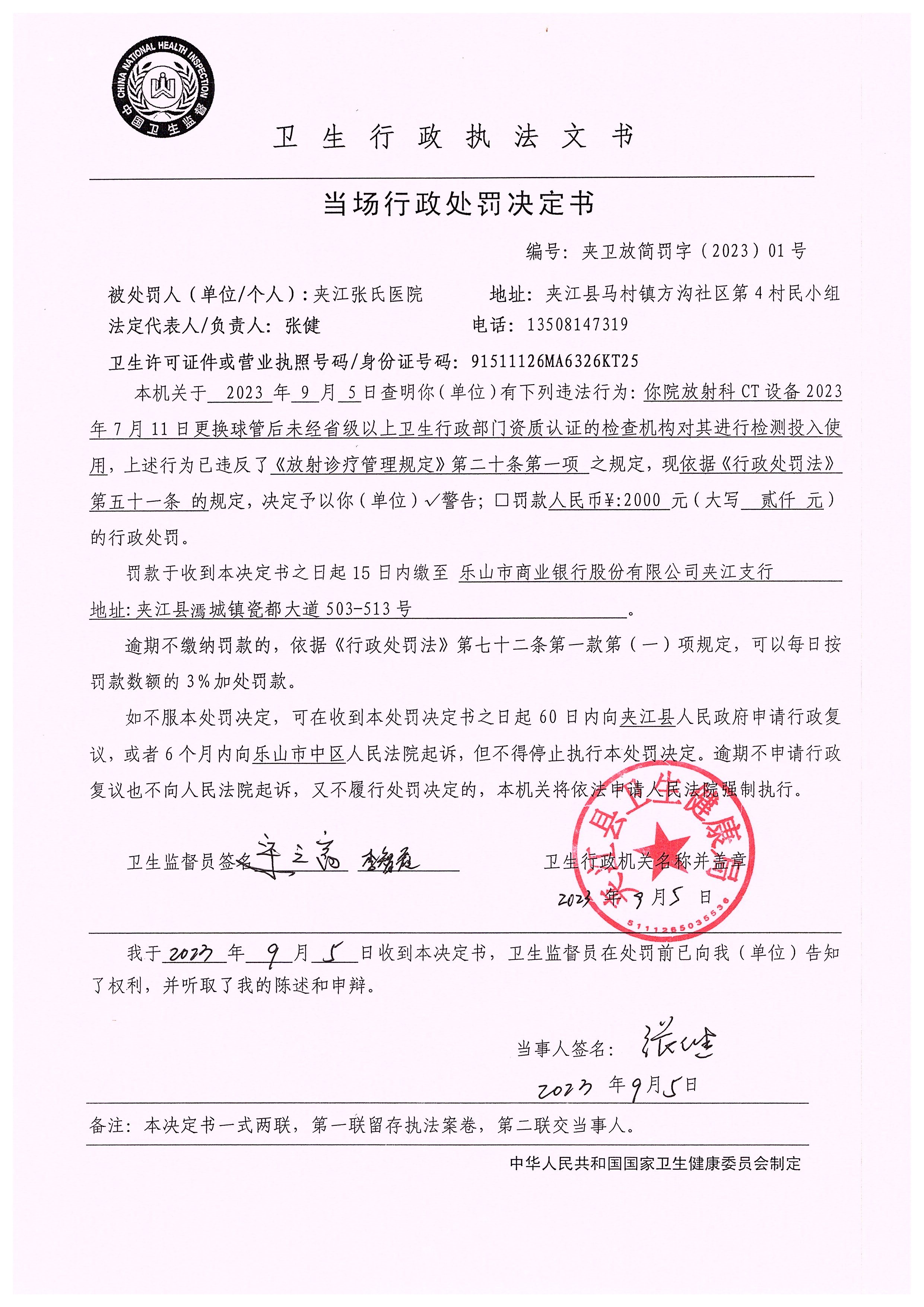 当场行政处罚决定书(夹江张氏医院)
