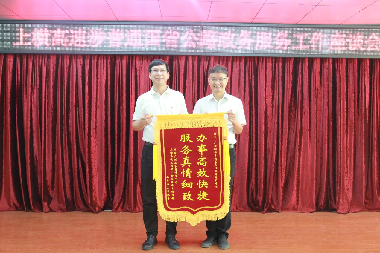 宾阳讯(通讯员 卢姗姗 莫祝梅 摄影报道)“感谢宾阳公路养护中心,高效、快速地完成对国道322线、省道309线上跨及路基拓宽、增设平交路口施工4项重大许可审批工作,为我们顺利完成上横高速全线通车作出了积极贡献。”。9月6日,中铁广州工程局集团有限公司上横高速公路第一合同段项目经理部向宾阳公路养护中心赠送了两面分别写着“办事高效快捷服务真情细致 ”“认真高效 廉洁公正 ”的锦旗。