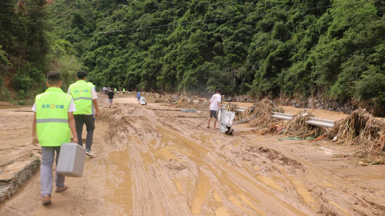上午8时,雨未停,国道357线公路路基冲空,路面塌陷,沿途洪水来势汹汹,农田汪洋一片,电杆倒塌,电力中断,信号全无,灾情紧急。凌云公路养护中心领导干部职工到达第一处断通现场,看着已被滚滚洪水淹没的路面和对面互相依靠等待的群众,在查看路面基本损毁情况后立即召开现场会,对当前灾情情况进行研判,部署抢险救灾工作,并成立指挥组。“时下最紧迫的是及时向人民群众通报断通情况。”凌云公路养护中心主任张国清说。