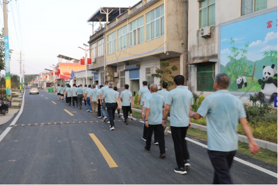 下午5:30,参加活动的70余名干部职工统一着装,在领队人员举旗带领下,排成百米长龙,浩浩荡荡地向着目的地出发。虽然天气有些炎热,但丝毫不减大家对健身的热情。职工们沿着乡村振兴大道阔步前进,以昂扬的姿态、矫健的步伐,展现出了积极向上的精神风貌。途中还利用外放音箱开展防电诈知识宣传,时刻提高居民们的反诈意识。