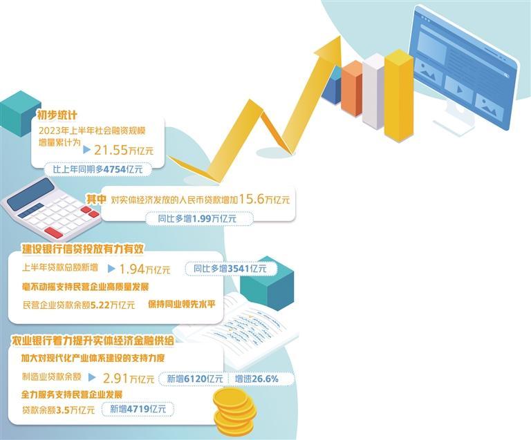 今年上半年以来,金融持续支持实体经济恢复发展和回升向好,金融体系对实体经济的支持进一步加大。初步统计,2023年上半年社会融资规模增量累计为21.55万亿元,比上年同期多4754亿元。其中,对实体经济发放的人民币贷款增加15.6万亿元,同比多增1.99万亿元。