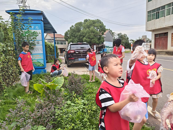 实践活动开始前,志愿者讲解了本次活动流程和安全注意事项。随后,孩子们在志愿者的带领下,身穿红马甲,手拎垃圾袋,来到茅圻村公交站附近捡拾藏在路边、草坪上、灌木丛中的垃圾。沿路藏在灌木丛和草坪内的垃圾都被“小天使们”捡拾在垃圾袋子里了。最后,镇团委为小志愿者们发放小礼品,鼓励孩子们积极参加志愿服务活动,共创美好环境。