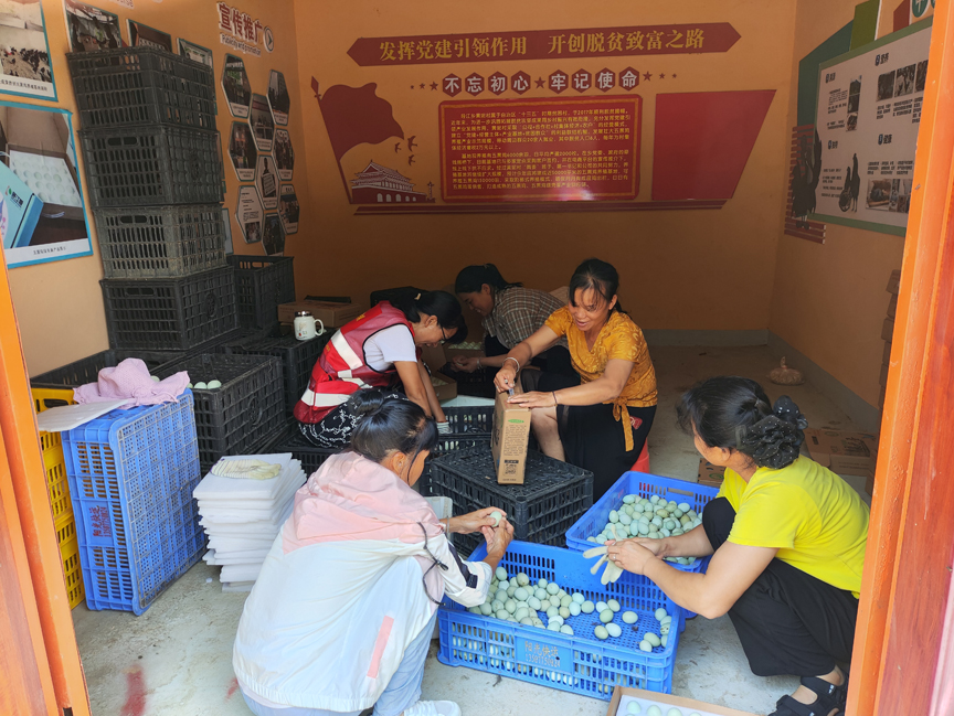 要想真正的发展好特色产业,除了养得好,还要卖得好。为了打开销路,黄坭村通过“线下订购+线上团购”的方式扩大销售渠道。线下,以各企事业单位批量订购为主,带动个人直接向村委会订购;线上,联系团购平台,通过团购平台聚合订单,进一步扩大销量。就在鸡蛋刚产出上市的这几天内,绿壳蛋就销售出一百多盒,销售金额三千多元,整个产蛋季预计产蛋量约8000斤,产值约十万元。