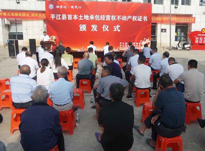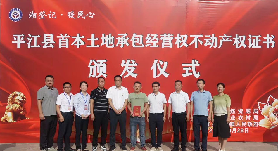 近日,平江县首本土地承包经营权不动产权证书颁发仪式在童市镇童坪村举行,这标志着我县土地承包经营权由分散登记进入统一登记时代,开启了不动产统一登记的新起点。