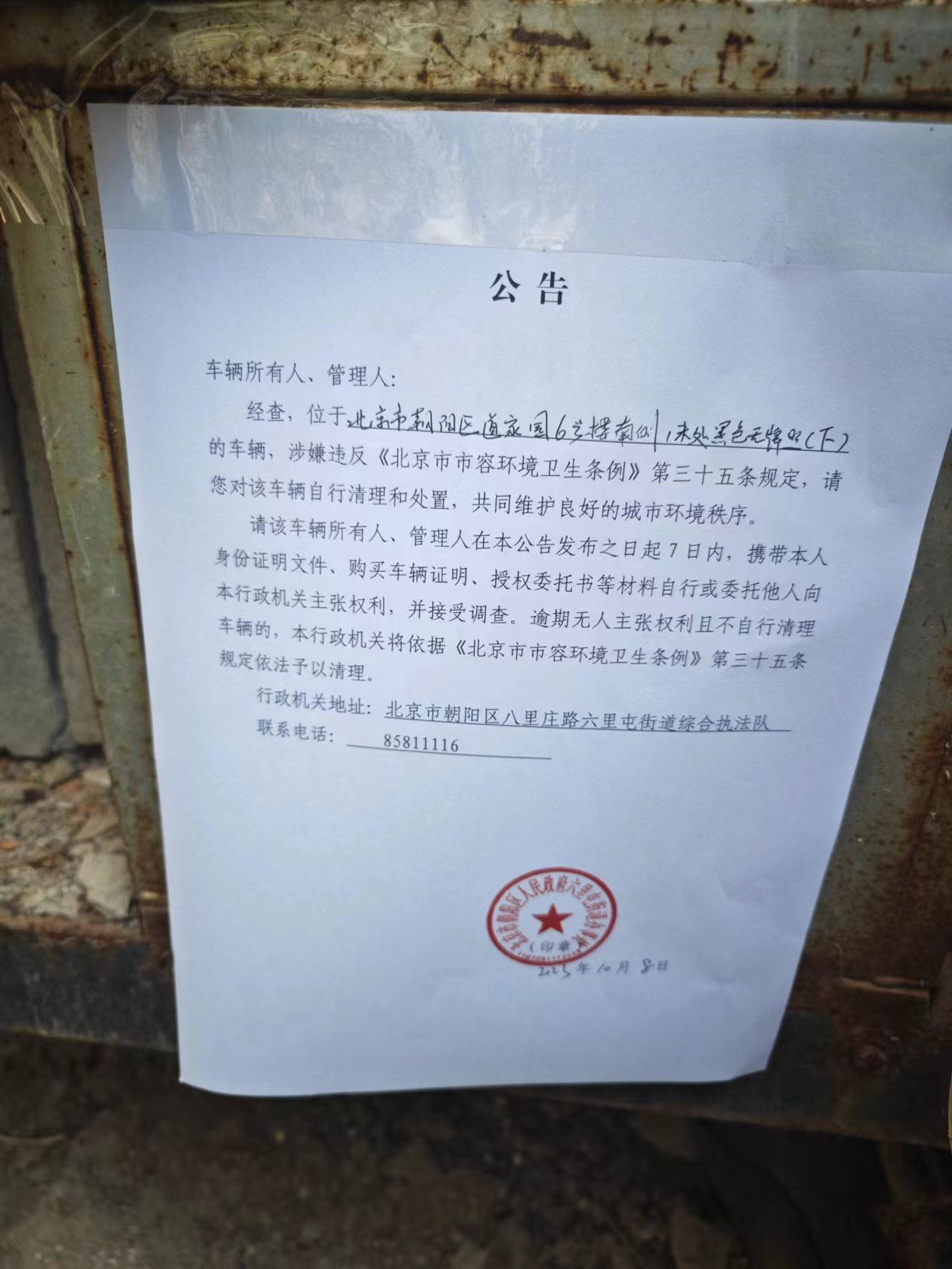 请该车辆所有人、管理人在本公告发布之日起7日内,携带本人身份证明文件、购买车辆证明、授权委托书等材料自行或委托他人向本行政机关主张权利,并接受调查。逾期无人主张权利且不自行清理车辆的,本行政机关将依据《北京市市容环境卫生条例》第三十五条规定依法予以清理。