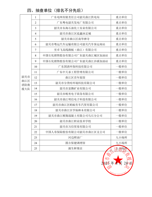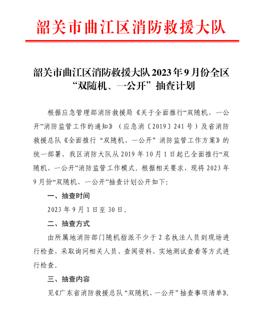 韶关市曲江区消防救援大队2023年9月份全区“双随机、一公开”抽查计划