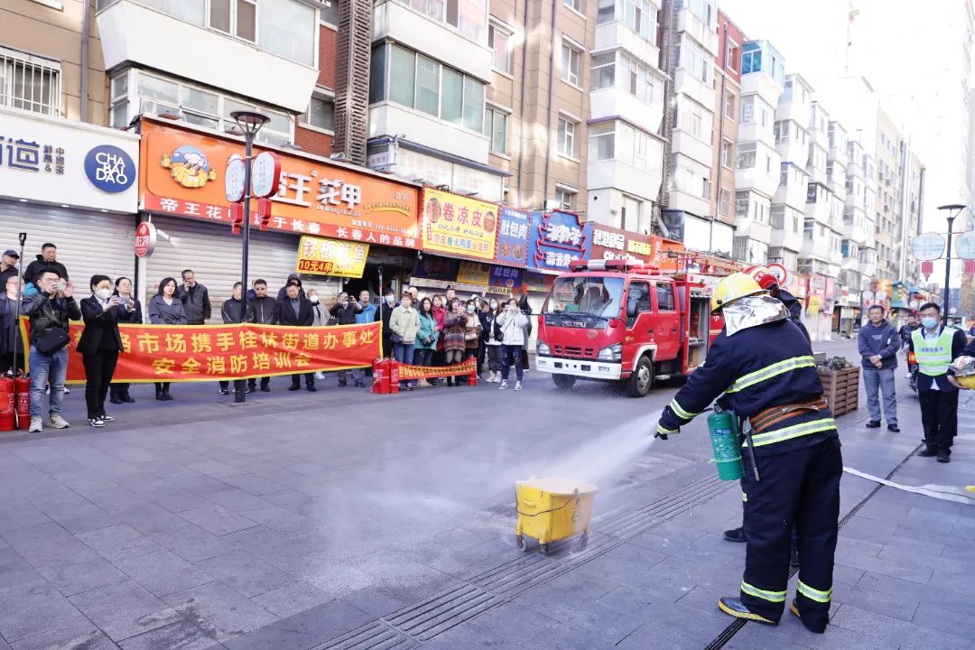 演练开始,在消防员的指导下,商户们有序疏散,迅速撤离到安全地带。现场,消防员进行灭火器实战操作,按照“提、拔、握、压”使用步骤,对准火焰喷射,示范如何利用灭火器灭火。在专业人员的指导下,商户们学习操作灭火器材。针对操作过程中不规范的行为,专业人员及时提醒并纠正,让商户们对消防器材的正确使用有了进一步认识。