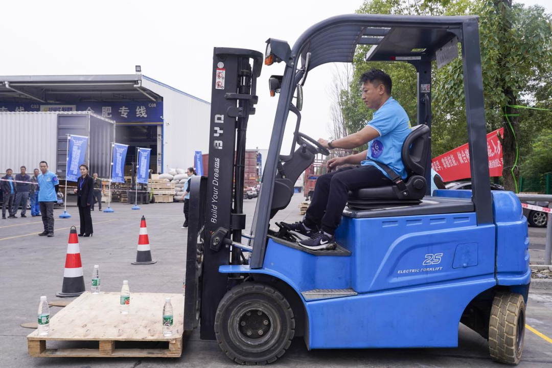 左手把握方向盘、右手紧握操纵杆,精准将货物搬运至指定位置……