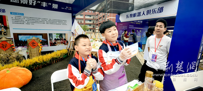 五谷是什么?请说出至少三个湖北著名的农产品。你知道世界粮食日是哪一天吗?稻谷的用途……东教生态与粮食安全俱乐部展区前挤满了有奖竞猜的人,答对问题可获得孩子们的自制小饼干。