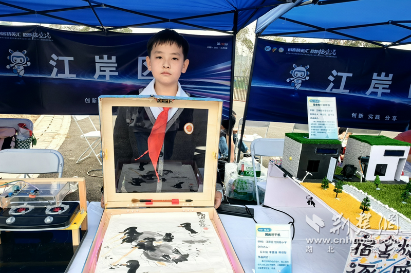 “两旁的小风扇让箱体内的空气流速变快,达到快速烘干的效果。按下掌控板的a键,可以设置转动时长,再按b键,小风扇就会转动。”江岸区沈阳路小学五年级的李盛潼展示了他们的国画速干机。江岸区主要展示三类创客作品,3D打印、激光雕刻和电子元器件制作的作品。