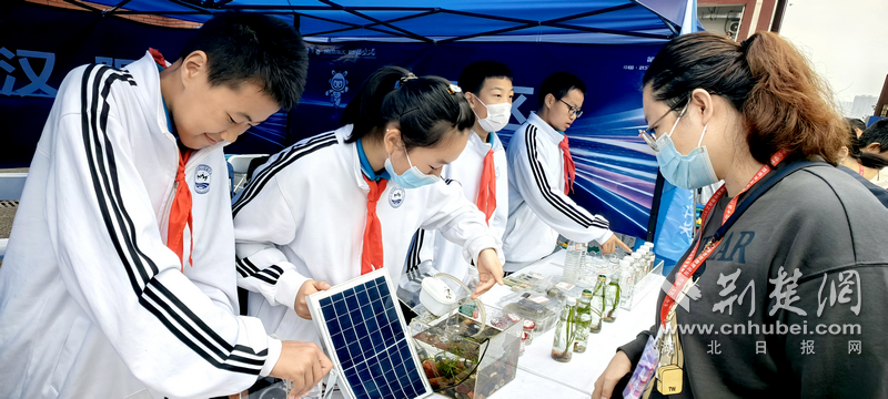 “太阳能板供电后,生态池的水泵可以把水抽上来过滤,实现水循环。”晴川初级中学学生喻诗琪说。“我这个是手摇式的,发电方式不同,都是为了改善水质。”陈乐棋同学在旁补充,左手还在不住地摇着。