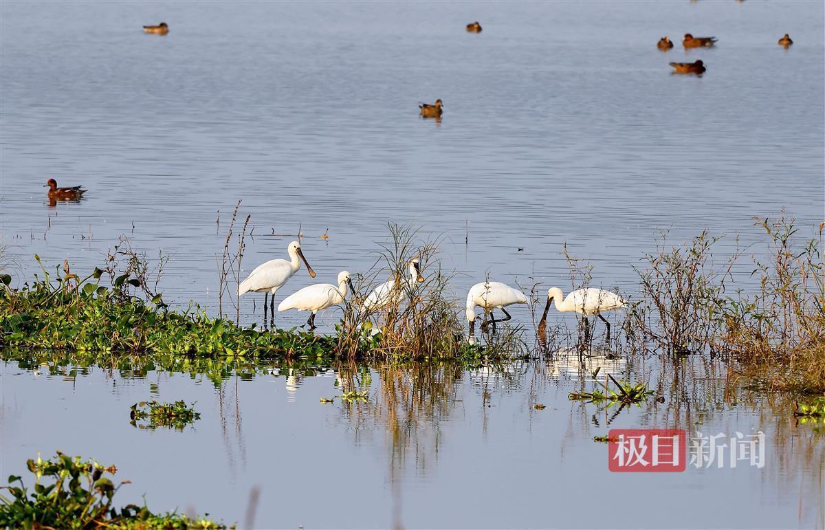 白琵鹭、豆雁、反嘴鹬、赤麻鸭……10月21日,武汉市东西湖区柏泉街府河天鹅湖,极目新闻记者现场看到,不少候鸟已抵达这里,它们或在湖中觅食,或在湖面上自由飞翔。