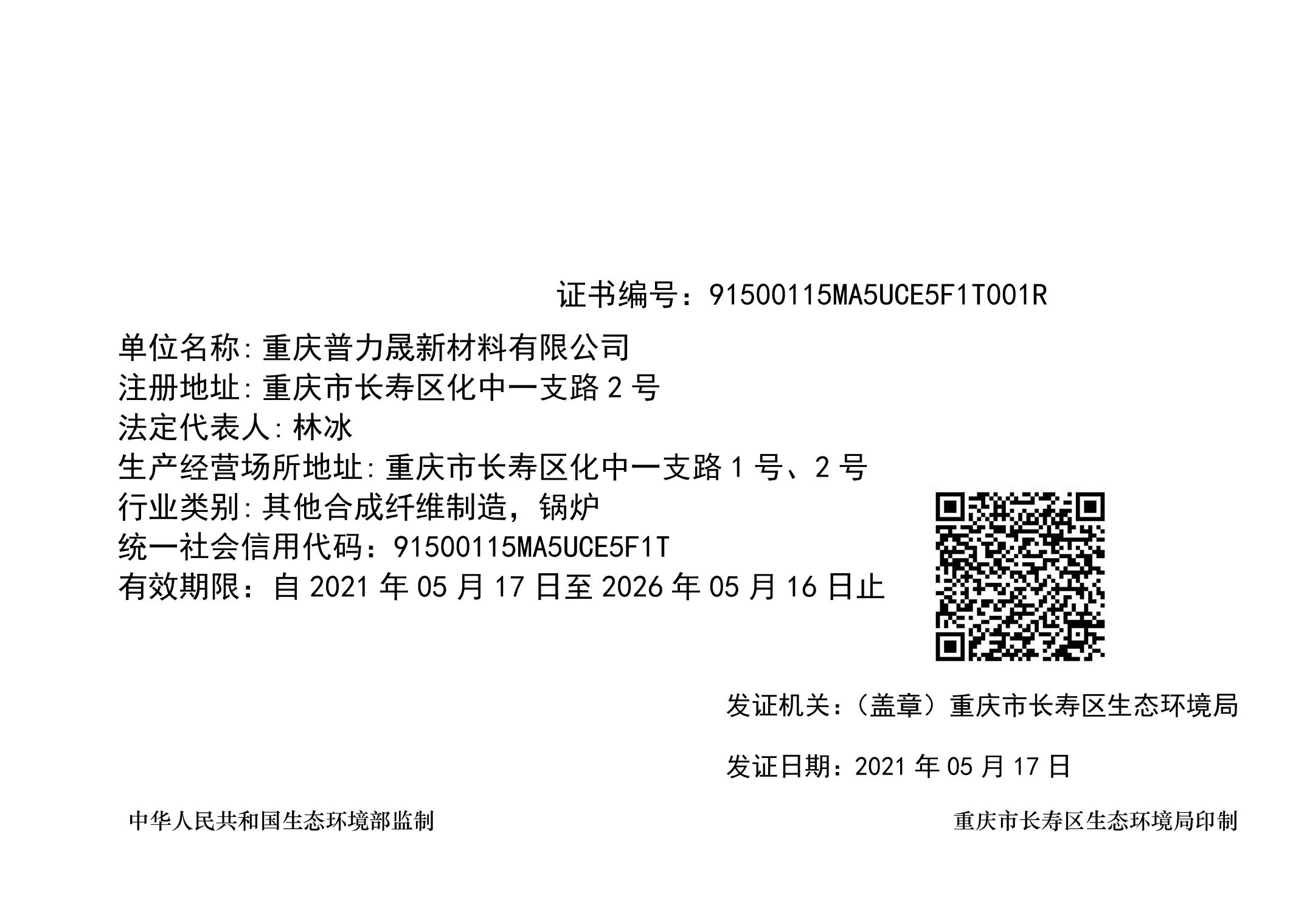 重庆普力晟新材料有限公司排污许可证