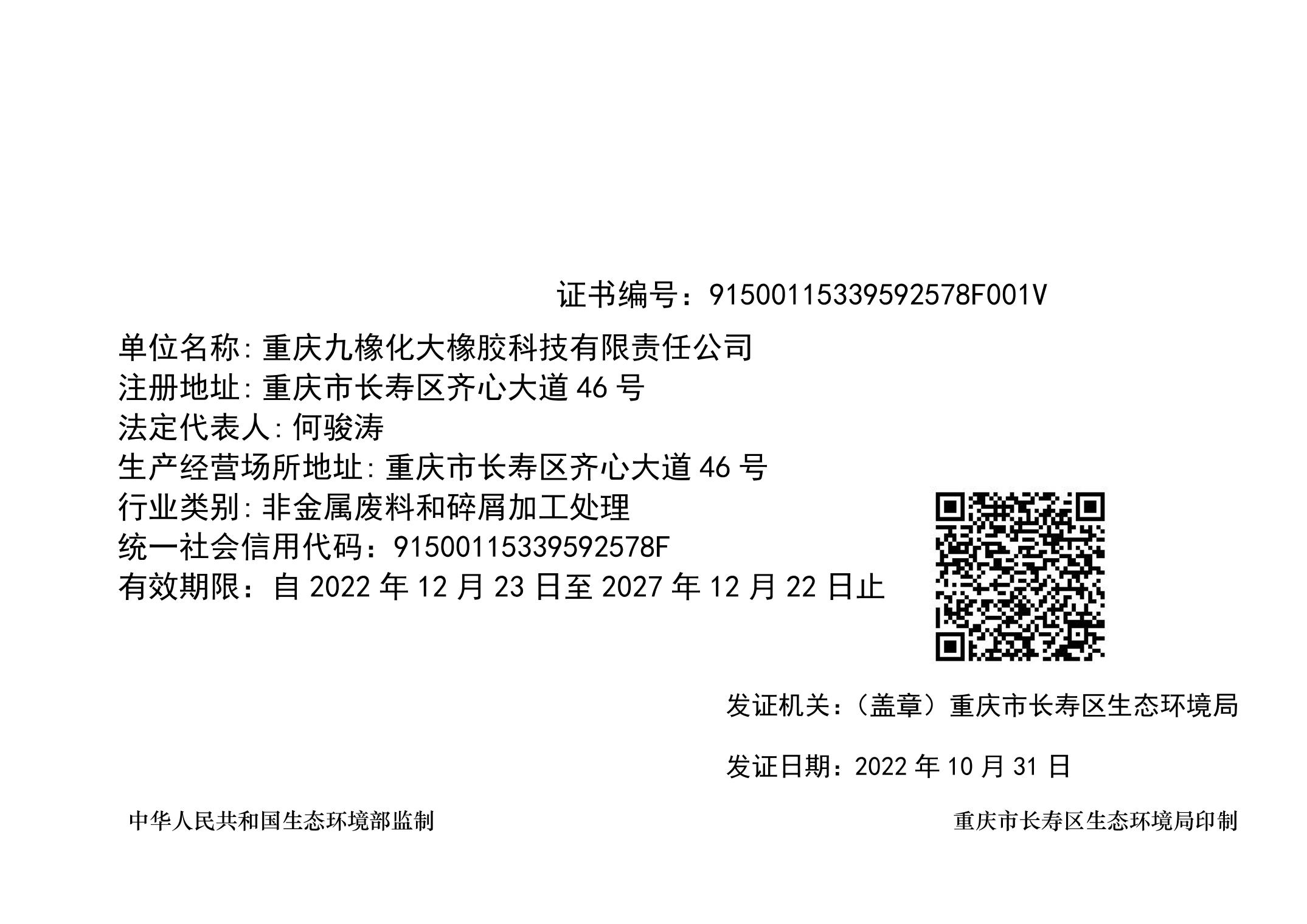 重庆九橡化大橡胶科技有限责任公司排污许可证