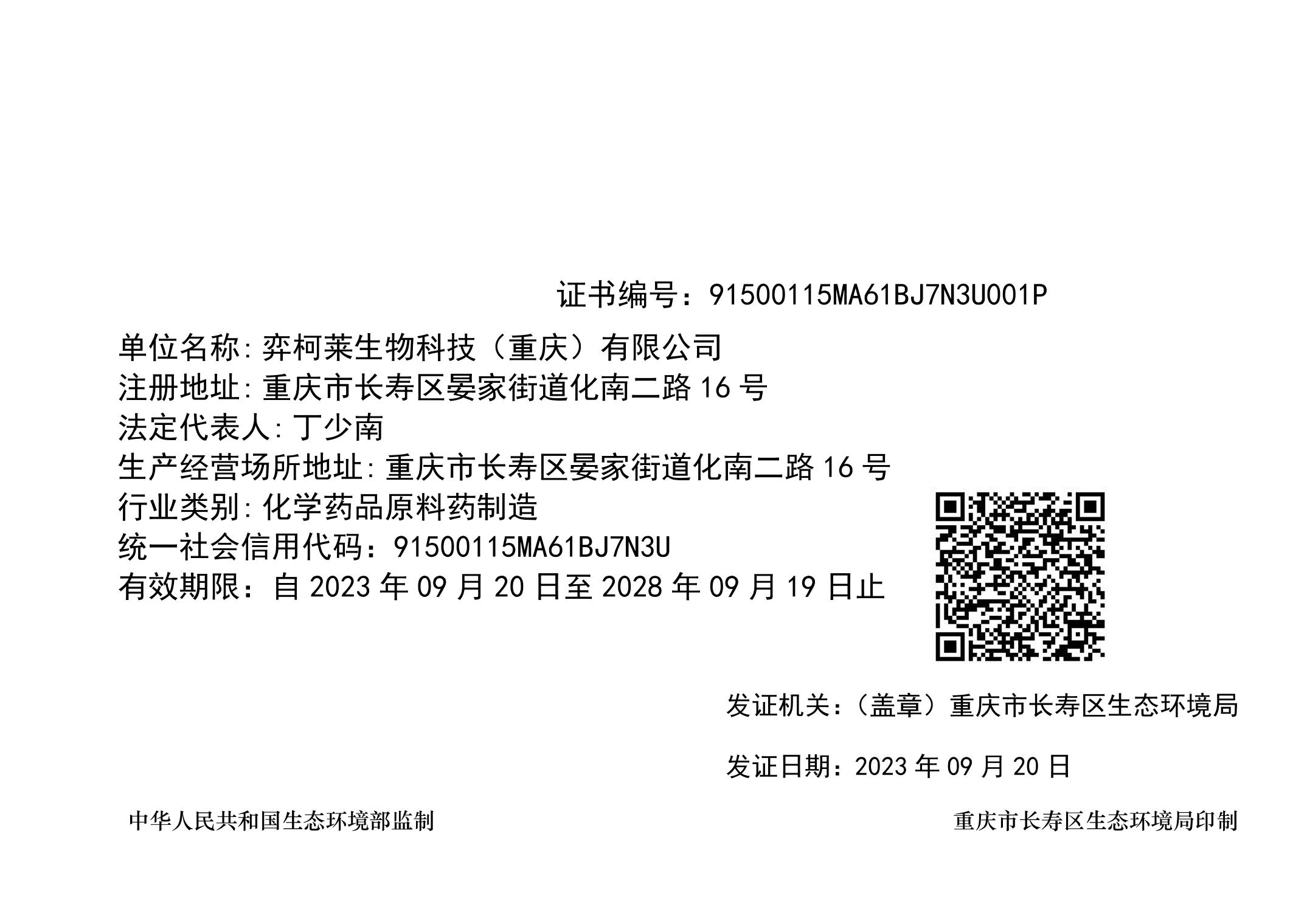 弈柯莱生物科技(重庆)有限公司排污许可证