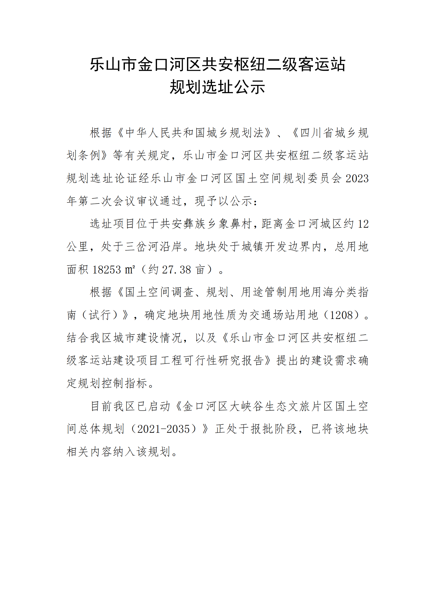 乐山市金口河区共安枢纽二级客运站 规划选址公示
