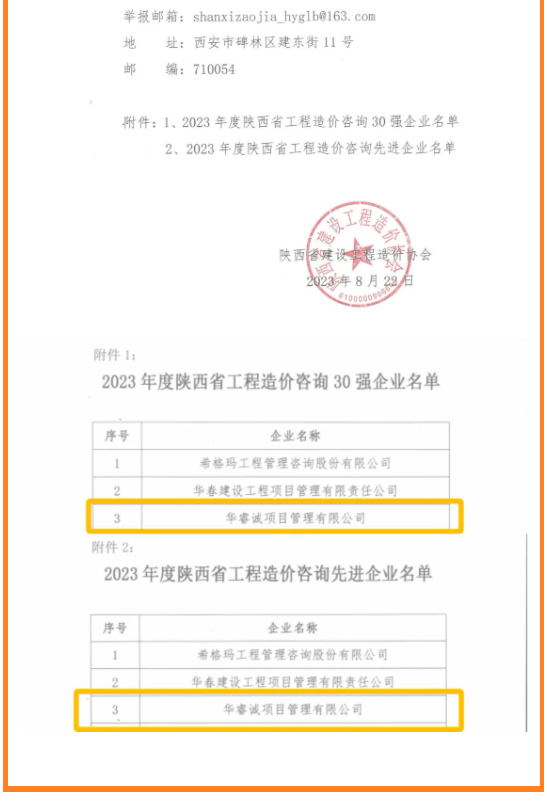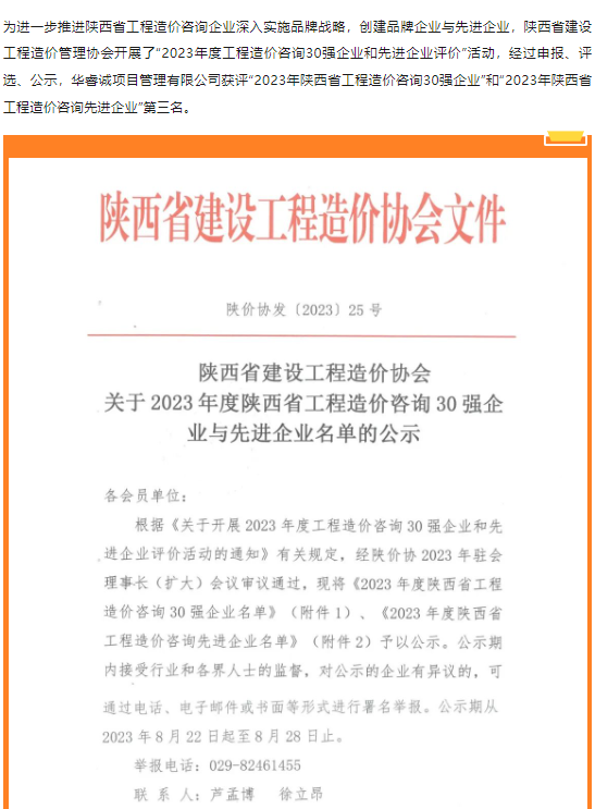【喜报】华睿诚项目管理有限公司荣列2023年度陕西省工程造价咨询30强企业与先进企业名单!