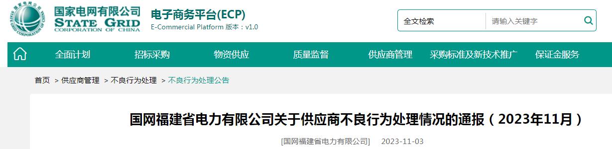 【电缆网讯】近日,国家电网电子商务平台发布《国网福建省电力有限公司关于供应商不良行为处理情况的通报(2023年11月)》。