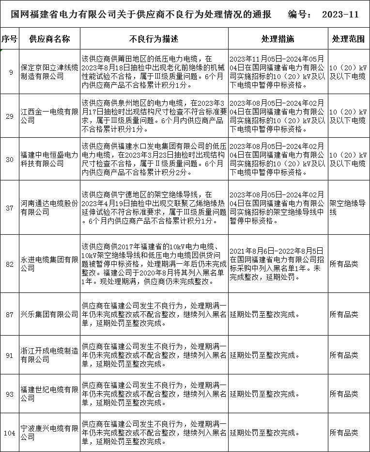 通报显示,保定京阳立津线缆制造有限公司、江西金一电缆有限公司、福建中电恒盛电力科技有限公司、河南通达电缆股份有限公司,在国网福建省电力有限公司发生不良行为,被暂停相关产品中标资格;永进电缆集团有限公司、兴乐集团有限公司、浙江开成电缆制造有限公司、福建世纪电缆有限公司、宁波康兴电缆有限公司,在国网福建省电力有限公司发生不良行为,未完成整改,被延期处罚,继续列入黑名单。