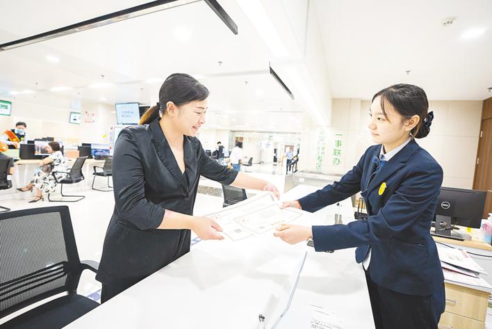 9月8日,在东西湖区政务中心,来自湖北赤焰建筑工程有限公司商务经理江雪琴(左)从工作人员手中接过崭新的营业执照,该公司也成为在东西湖区登记注册的第20万家市场主体。