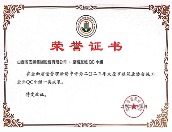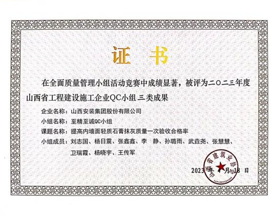 在项目建设过程中,集团始终秉承“安全第一,质量为本”的理念,多措并举抓前期,攻坚克难保进度,先后克服疫情反复、工期紧张等不利因素。为提高轻质石膏抹灰一次验收合格率,项目部成立专业质量管理小组,历经4个月的实践及探索,熟练掌握了轻质石膏抹灰施工工艺及操作要点。创新工作思路,通过使用“5M”管理工具,分析了轻质石膏抹灰实测实量合格率低的原因。经过归纳总结,形成实用新型专利1项,获山西省QC成果1项,太原市QC成果1项,为建设同类型工程提供了有力的技术支撑,为项目的交付打下坚实基础。