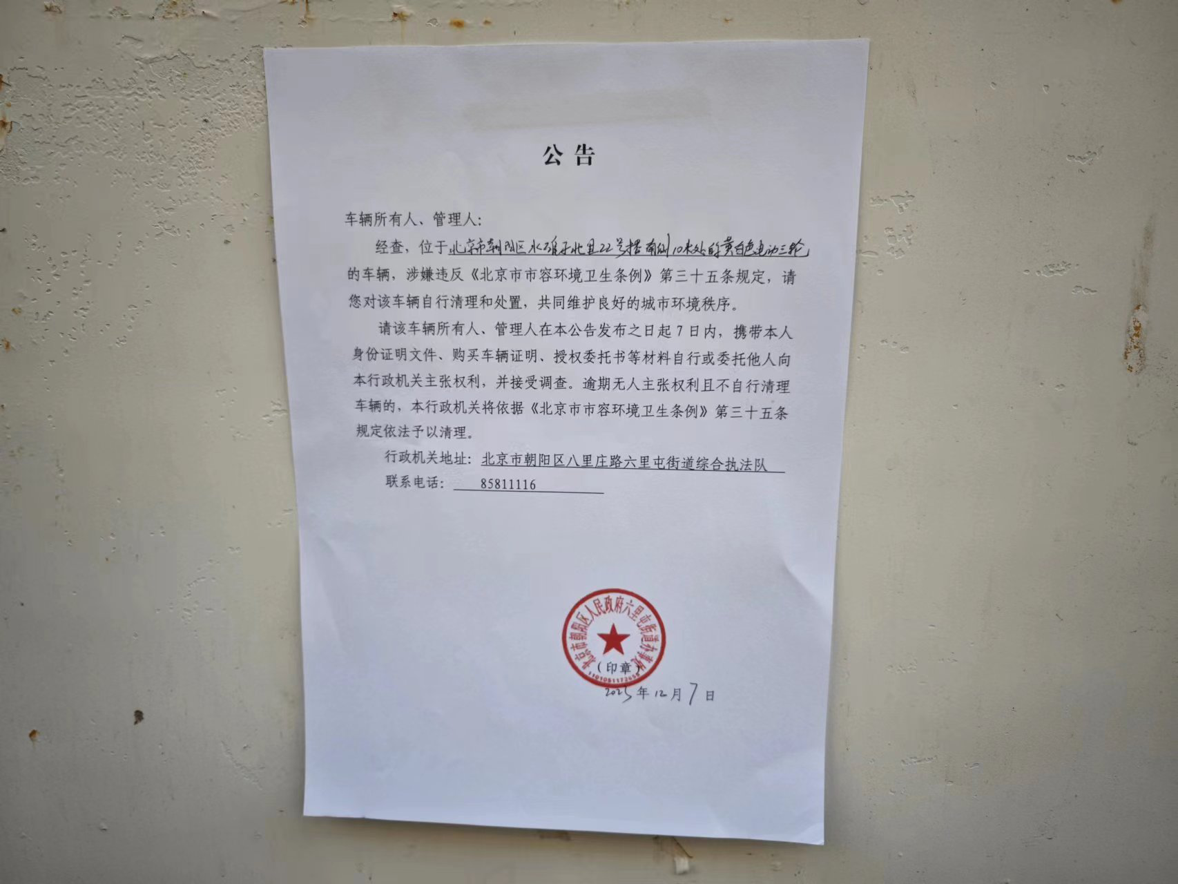 六里屯街道关于清理整治废弃电动三四轮车的公告(水碓子北里22号...