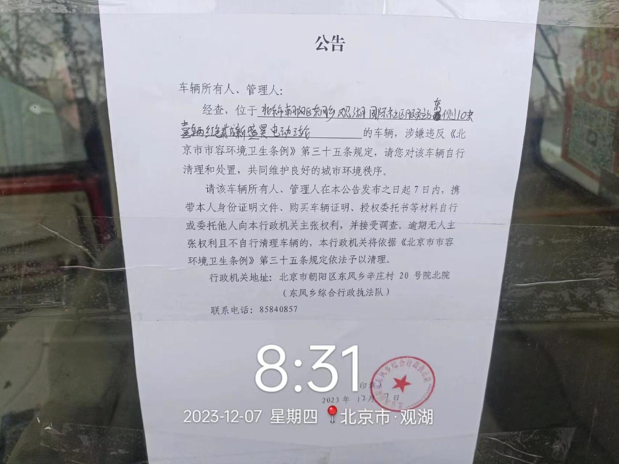 请该车辆所有人、管理人在本公告发布之日起7日内,携带本人身份证明文件、购买车辆证明、授权委托书等材料自行或委托他人向本行政机关主张权利,并接受调查。逾期无人主张权利且不自行清理车辆的,本行政机关将依据《北京市市容环境卫生条例》第三十五条规定依法予以清理。