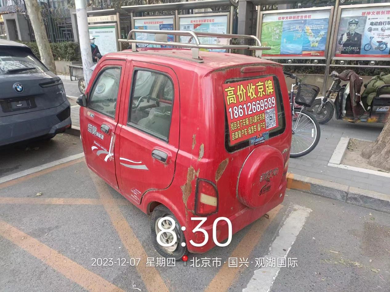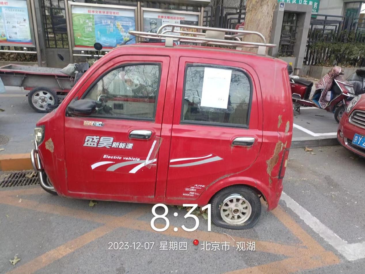 经查,位于北京市朝阳区东风乡观湖国际社区服务站东侧10米处停放壹辆红色贰成新盛昊电动三轮的车辆,涉嫌违反《北京市市容环境卫生条例》第三十五条规定,请您对该车辆自行清理和处置,共同维护良好的城市环境秩序。