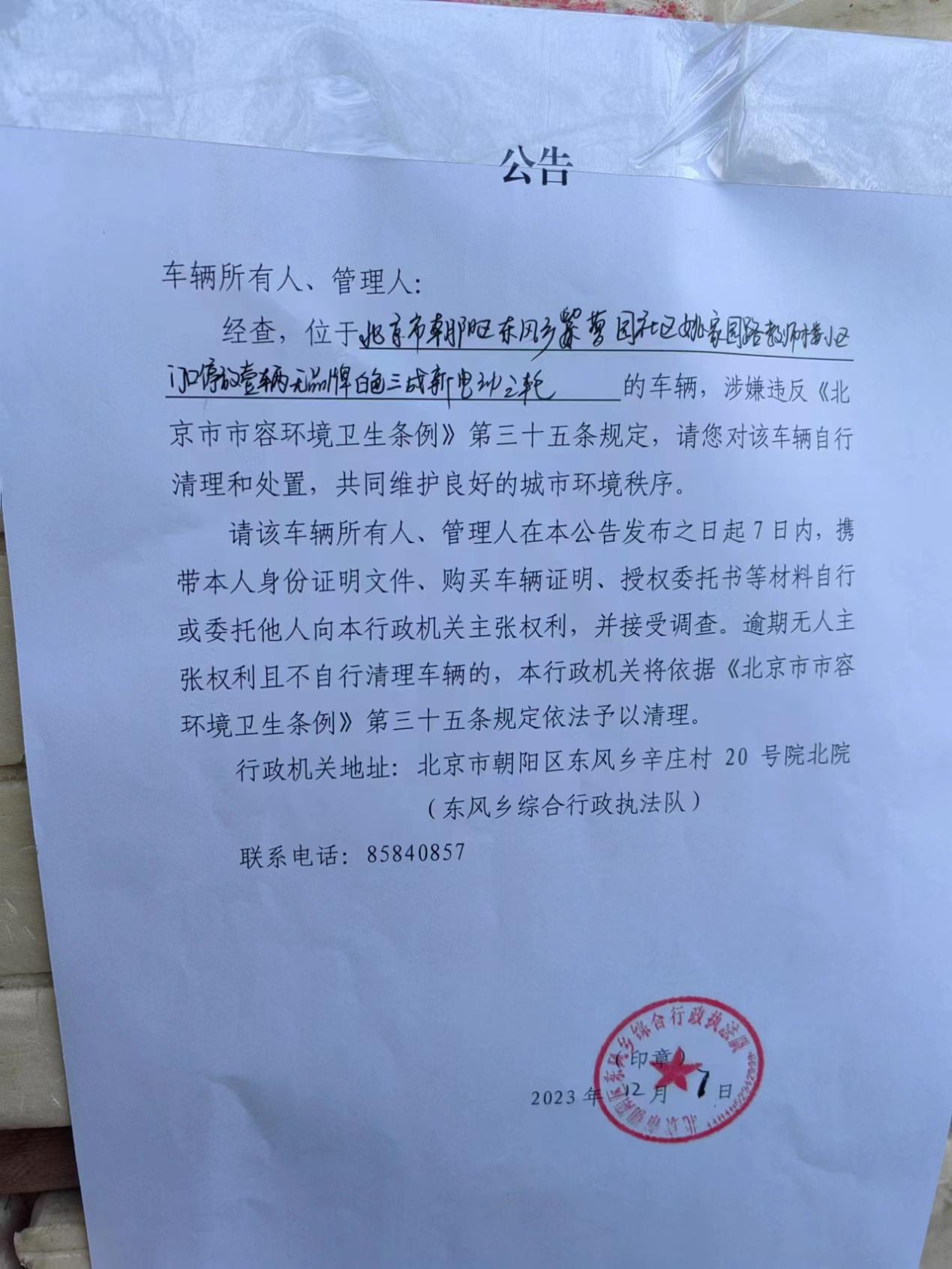 经查,位于北京市朝阳区东风乡紫罗园社区姚家园路教师楼小区门口停放壹辆无品牌白色三成新电动三轮的车辆,涉嫌违反《北京市市容环境卫生条例》第三十五条规定,请您对该车辆自行清理和处置,共同维护良好的城市环境秩序。
