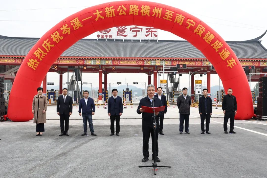 南宁讯(黄静兰?通讯员?张福友?陈潘俊?潘滢红?摄影报道)12月31日,岑溪至大新公路横县至南宁段(以下简称南横高速)通车仪式在南宁市举行,至此,广西高速公路通车总里程突破9000公里。自治区交通运输厅副厅长黄永忠出席通车仪式并宣布项目建成通车。中铁交通投资集团董事长李建光等出席通车仪式。