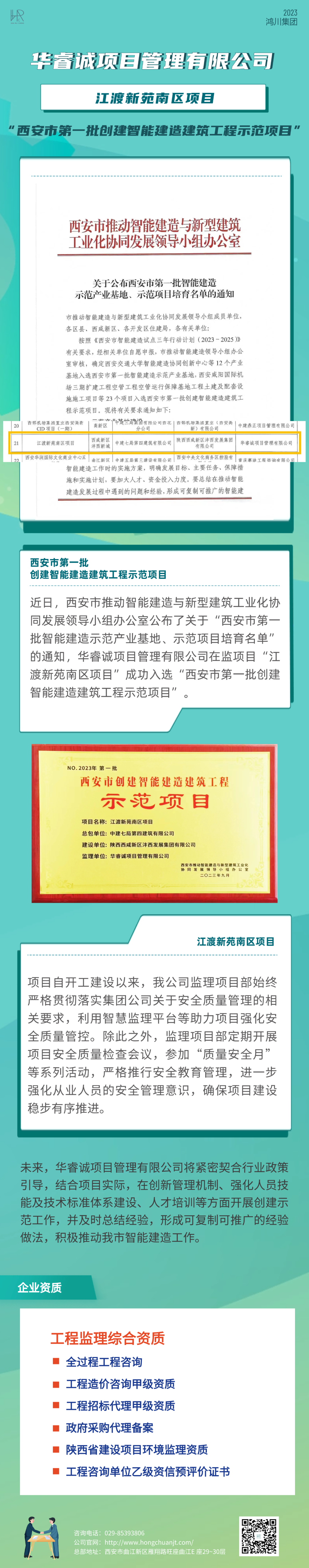 华睿诚项目管理有限公司在监项目入选为2023年“西安市第一批创建智能建造建筑工程示范项目”