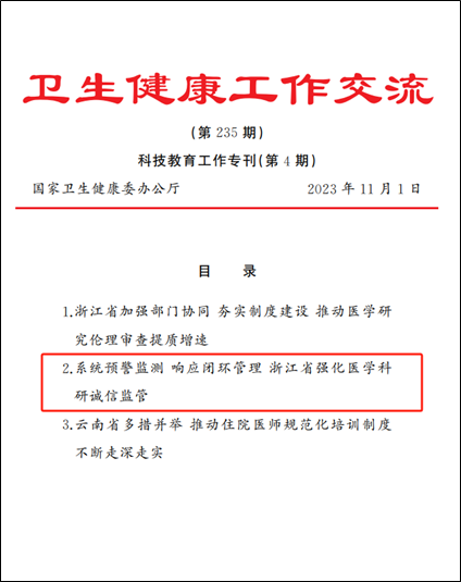 日前,由浙江省卫生健康委主导,我校医学情报中心(浙江省医学情报研究所)开发建设的“浙江省医疗卫生机构科研诚信舆情案件管理系统”和“浙江省医学科教资讯平台”在国家卫生健康委《卫生健康工作交流》科技教育工作专刊(第4期)作经验交流(全国共三项)。
